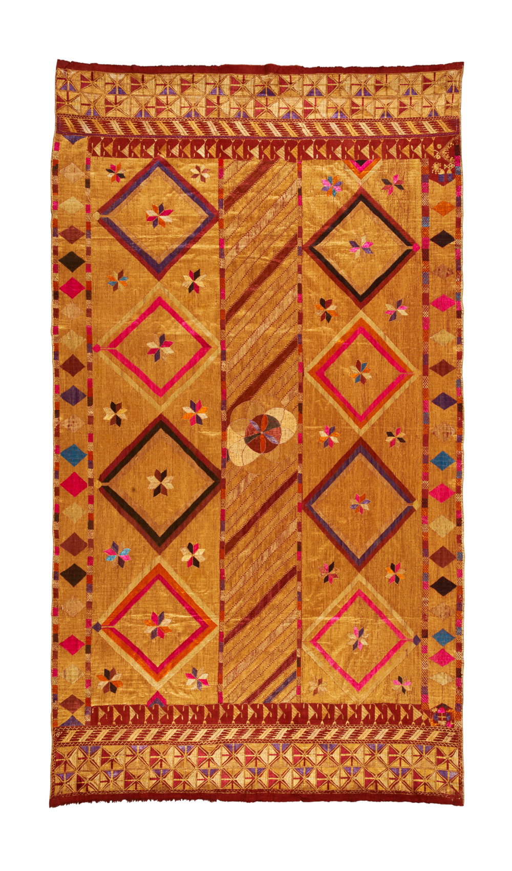 En la regióó rural del Punjab, las mujeres han participado y conservado a lo largo de los años la tradición textil de la confección del phulkari. El término phulkari hace referencia a los motivos florales estilizados que aparecen en la mayoría de estos ornamentados textiles, así como a los propios textiles. El bordado era un medio de expresión fundamental para las mujeres, y el phulkari se confeccionaba de forma cooperativa dentro de las familias y las aldeas. Estos textiles tenían múltiples usos, ya que servían como mantas, chales y tapices decorativos. Contemple impresionantes ejemplos de phulkaris en Flores del Punjab: Textiles de la India, procedentes de la Colección de la Familia Khanuja.