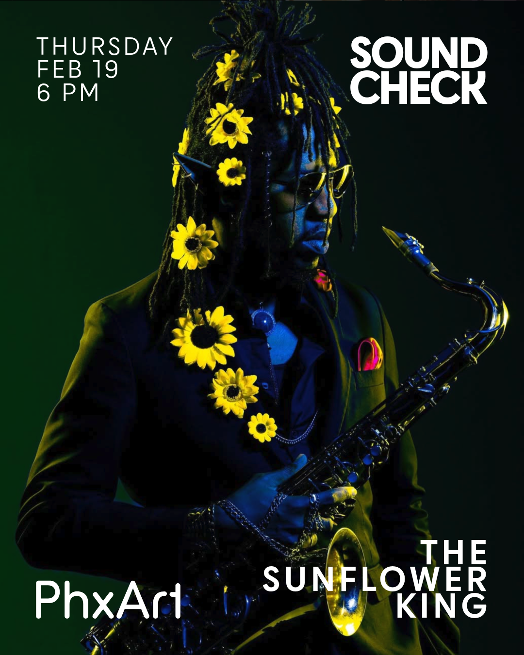 This February, SOUNDCHECK, welcomes Sunflower King to PhxArt. The Sunflower King (Ashton Vaughn Charles) is a Premier International Destination Event Saxophonist who is passionate about any and every form of expressive artistry. Whether he’s performing on stage in front of thousands, in intimate spaces for small groups, or creating and recording music in his studio, The Sunflower King is best known for expressing himself through multiple genres, ranging from Neo-Soul, R&B, Jazz, Hip-Hop, Afrobeat, Metal, and more.