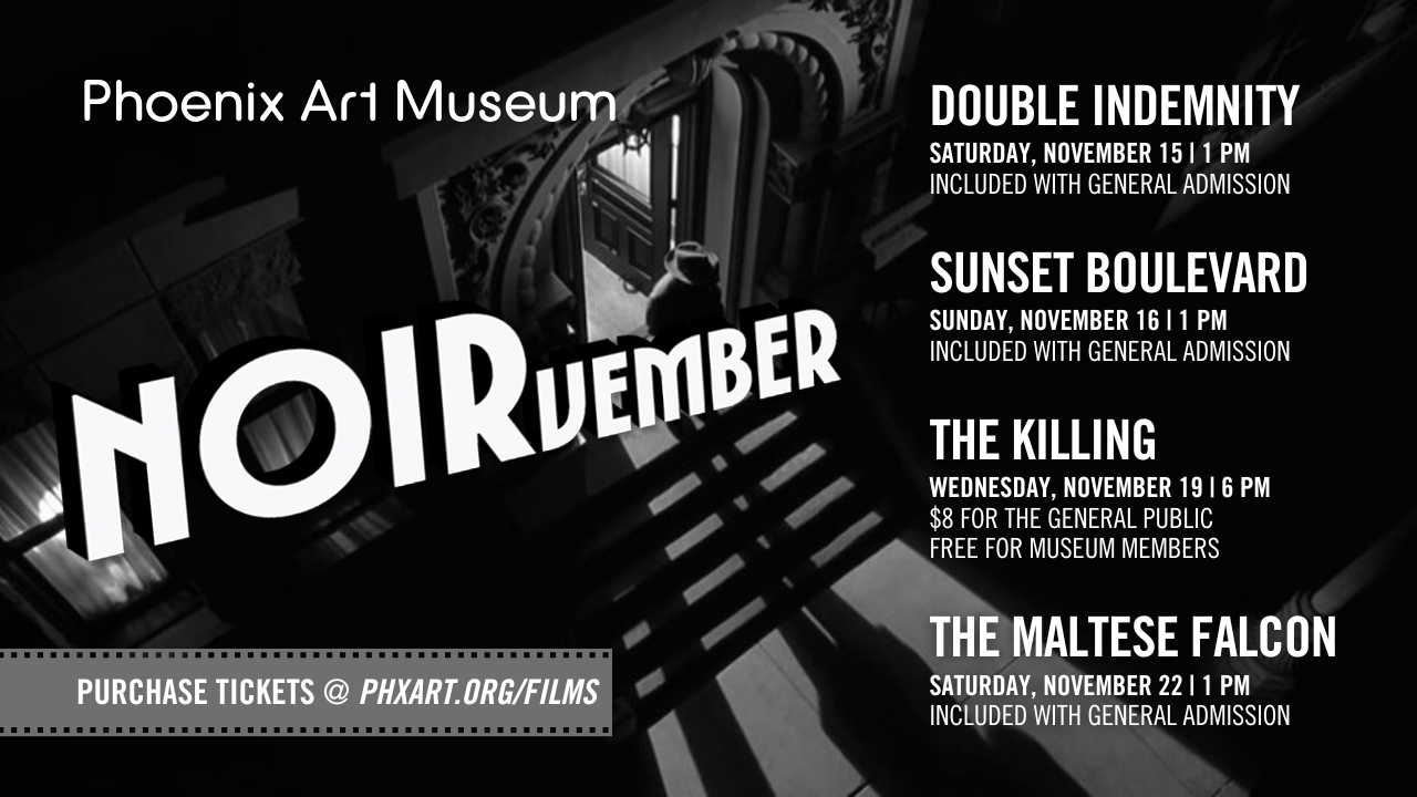 Celebrate the classic era of American cinema with NOIRvember at PhxArt, a series dedicated to the films that defined film noir: a world of fatalism, shadows, and cynical anti-heroes. This selection dives deep into the genre’s darkest corners, featuring masterworks from legendary directors and performances from iconic stars. Explore noir’s defining elements including chiaroscuro lighting, intricate plotting, and seductive danger, as we screen these four classics: Double Indemnity, Sunset Boulevard, The Killing, and The Maltese Falcon.